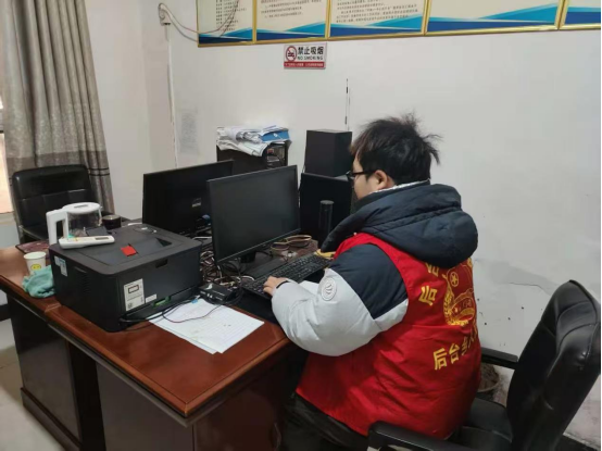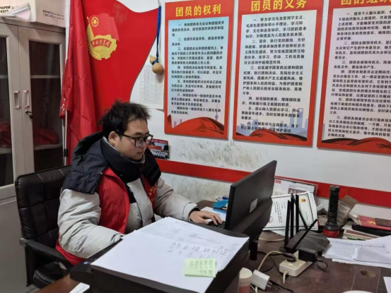 在寒假期间 ,马怡晨负责村民档案整理与补贴信息的录入, 起初面对堆积的纸质档案经常出错,他与同事不辞辛苦地核对补贴发放名单,认真比对电脑屏幕上的数据,背景墙上"中国共青团 "海报与工作场景相映成趣。